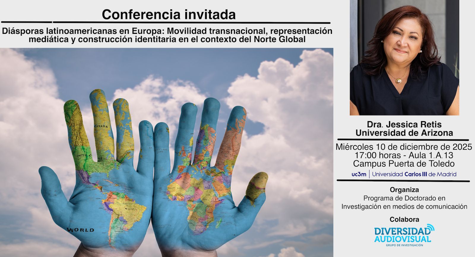 La profesora de la Universidad de Arizona, Jessica Retis impartió el miércoles 10 de diciembre la charla “Diásporas latinoamericanas en Europa: Movilidad transnacional, representación mediática y construcción identitaria en el contexto del Norte Global”, a las 17 horas en el aula 1.A.13 del campus de Puerta de Toledo. La conferencia ha sido organizada por el Programa de Doctorado en Investigación en Medios de Comunicación, con la colaboración del grupo de investigación Diversidad Audiovisual.