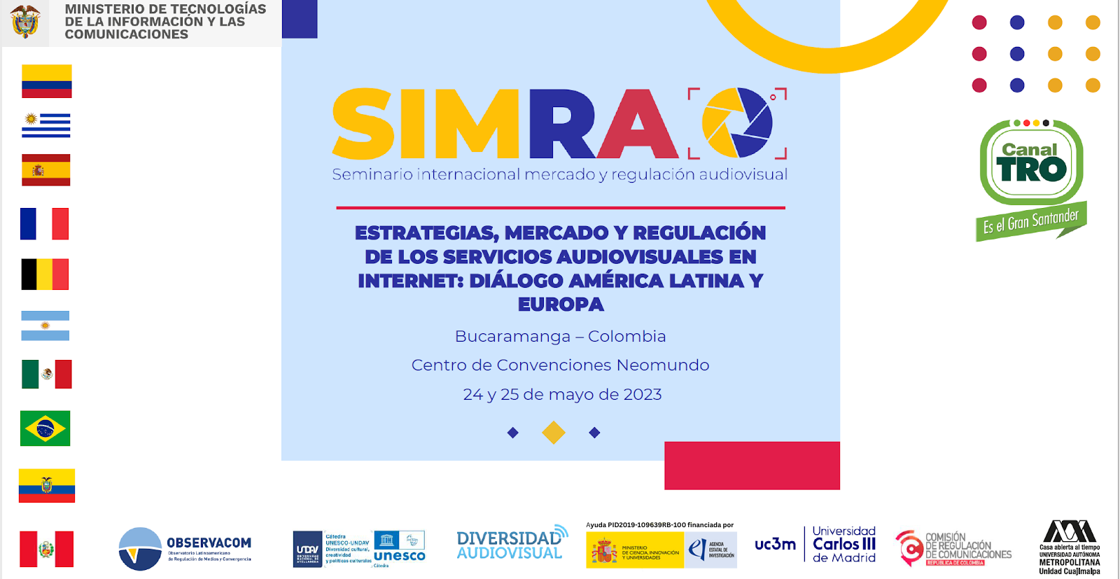 El grupo de Investigación Diversidad Audiovisual co-organizó el Seminario Internacional Mercado y Regulación Audiovisual “Estrategias, mercado y regulación de los servicios audiovisuales en Internet: diálogo América Latina y Europa”, que se celebró en Bucaramanga, Colombia, los días 24 y 25 de mayo de 2023.